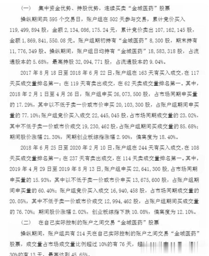 这104个账户就像他们操纵股价的“棋子”,在595个交易日里,有502天都活跃在交易场上。他们凭借着集中的资金优势和持股优势,在二级市场上连续买卖,还频繁在自己实际控制的账户之间进行“对倒”交易。数据统计显示,该账户组日均持有“金城医药”1858.33万股,占公司流通股本的5.68%,最高持股量甚至达到了3209.48万股,占流通股本的比例高达9.04%。这操作,简直是把股市当成了自家的“提款机”,肆意妄为!